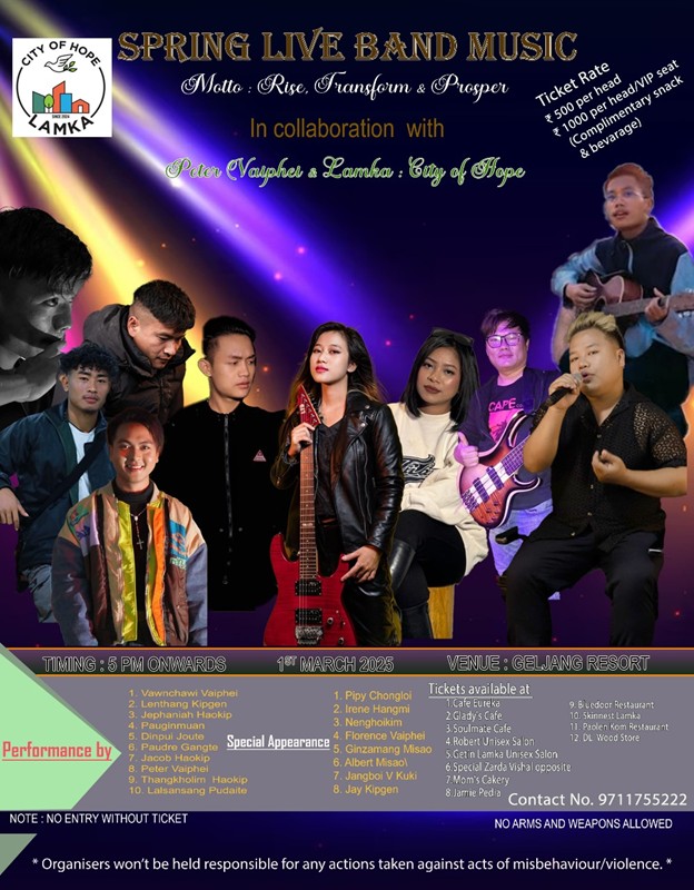 The Spring Live Band Music event, held on 1st March 2025 at Geljang Resort, was a night that exuded joy, comradeship, and hope. Organized by Peter Vaiphei and Lamka: City of Hope, the celebration brought together people from all walks of life in a shared expression of unity and renewal. The evening resonated with the vision of Lamka—to rise, transform, and prosper as a community grounded in peace, harmony, and love. A host of talented artistes, including Vawnchawi Vaiphei, Lenthang Kipgen, Jephaniah Haokin, Pauginmuan, Dinpui Joute, Florence Vaiphei, Pipi Chongloi, Thangkholim Haokip, Lalsansang Pudaite, Irene Hangmi, Jangboi V, Jay Kipgen, and others, lit up the stage with their soulful performances. Their energy and artistry, joined by Paudre Gangte, Nenghoikim, and Albert Misao, made the evening an unforgettable celebration—an uplifting reminder that through music and togetherness, the people of Lamka continue to build a city rooted in resilience, friendship, and enduring hope.